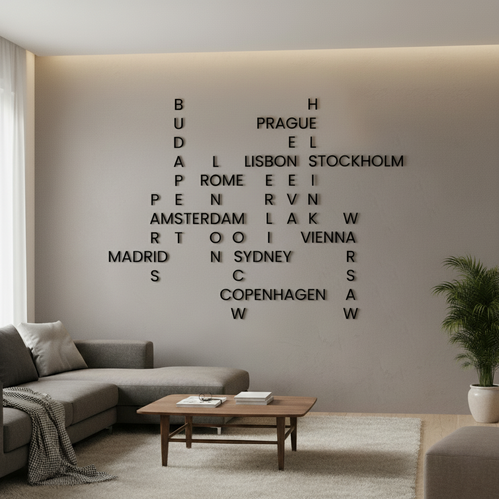Transform any wall into a conversation piece with our EU Capitals Crossword Wall Art Kit. This unique set lets you create an interconnected crossword puzzle featuring 16 iconic European capital cities, all crafted from high-quality 3D letters.