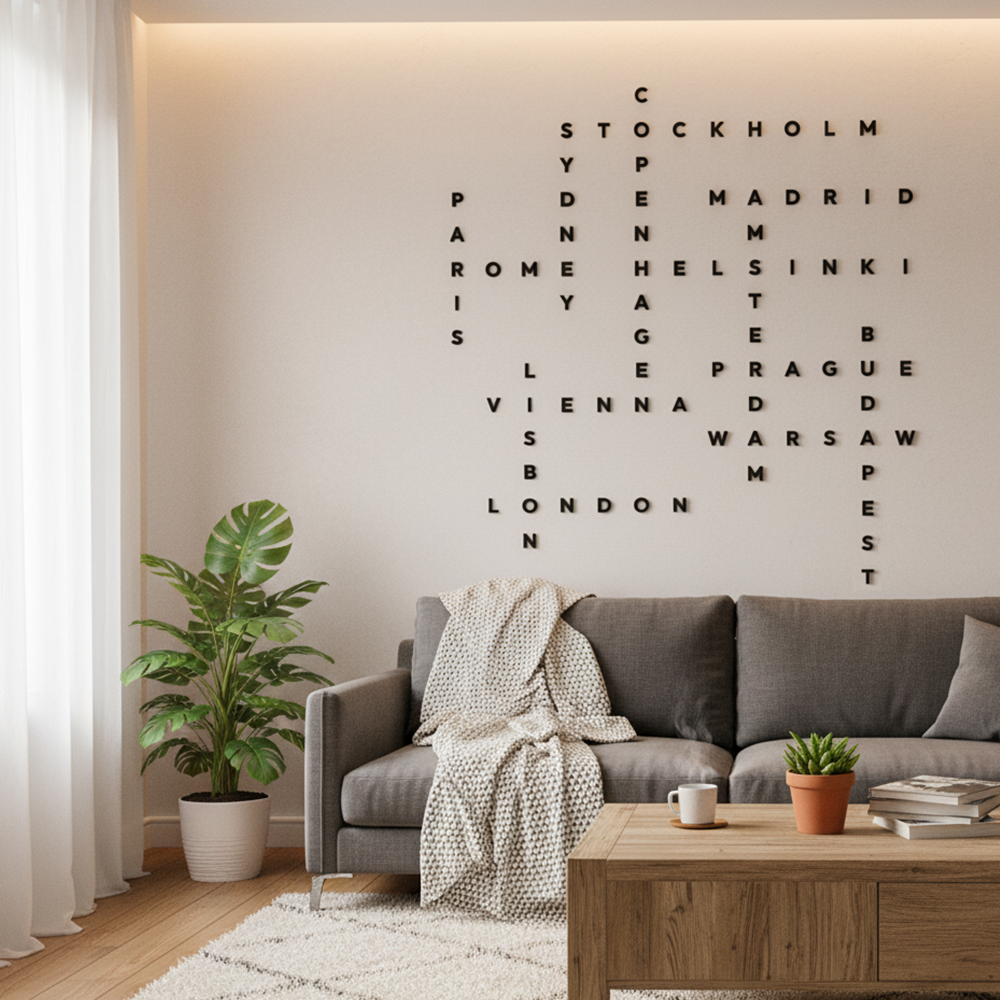 Plan your layout on the floor first before mounting. Use a level or ruler to ensure straight lines. Start with the longest word (COPENHAGEN, 10 letters) and build the crossword pattern outward. Leave approximately 1cm between letters for the classic crossword look.